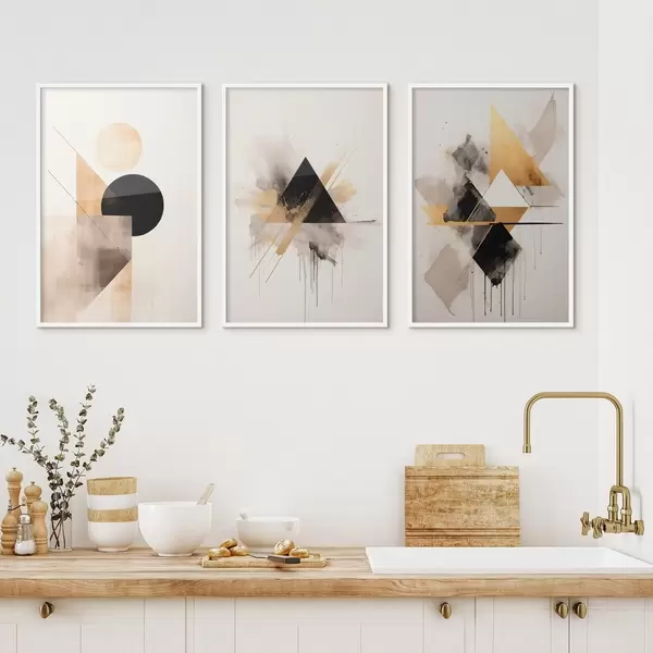Poster Geometrické trojúhelníky s rozstříknutou barvou, černá a okrová Č. d00963