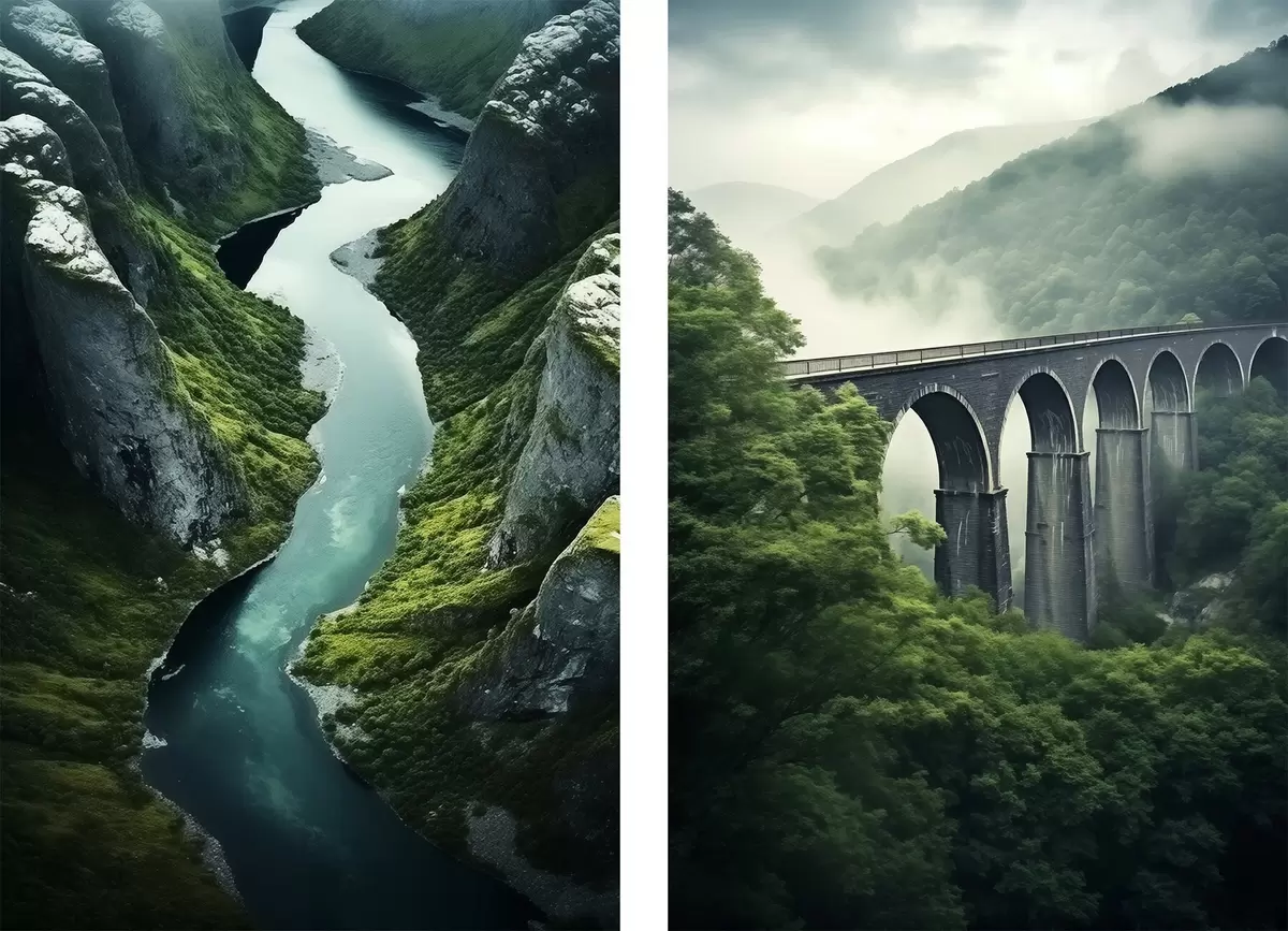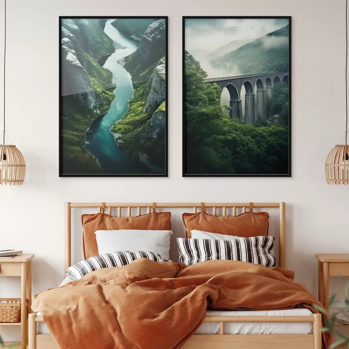 Poster Letecký pohled na říční kaňon a mlhavý viadukt v zelených kopcích Č. d00967