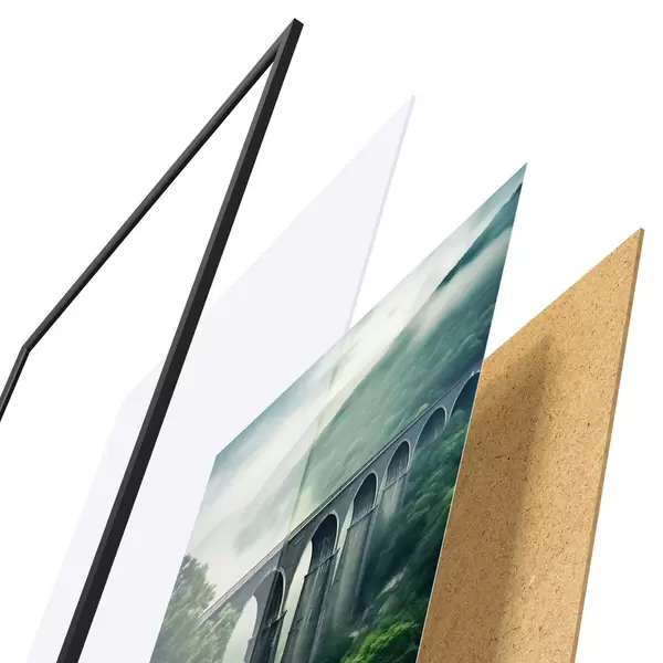 Plakát se skládá z rámu, plexiskla, tištěného obrazu a dřevotřískového podkladu. Díky úchytům na zadní straně lze plakát ihned zavěsit na zeď.