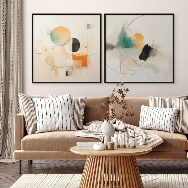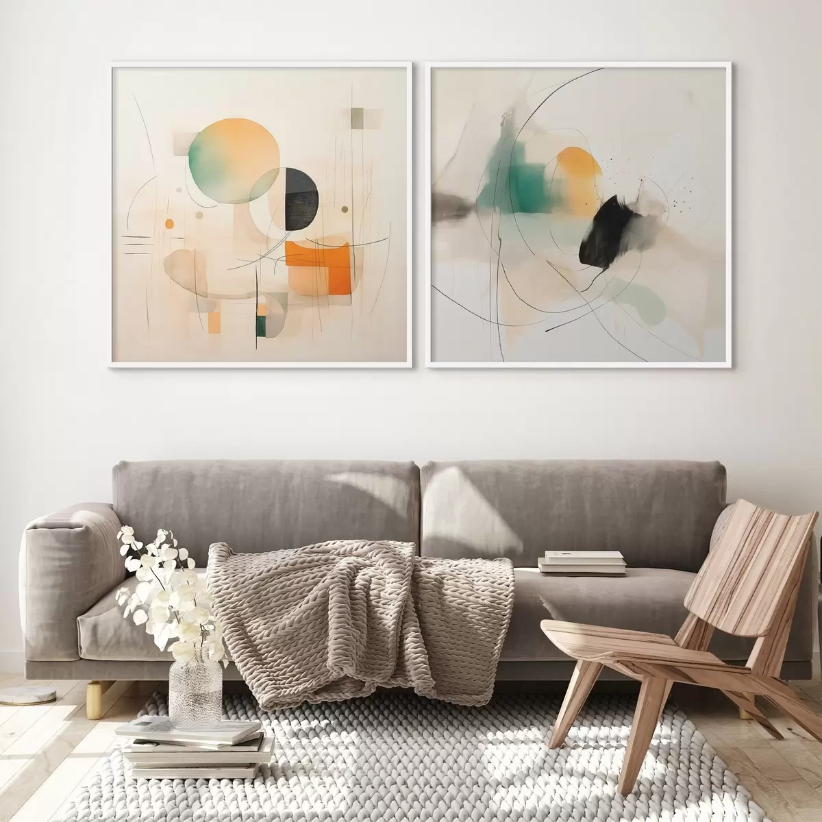 Poster Abstraktní diptych s kruhovými tvary a dynamickými liniemi Č. d00981