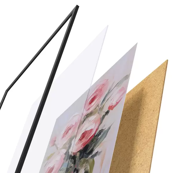 Plakát se skládá z rámu, plexiskla, tištěného obrazu a dřevotřískového podkladu. Díky úchytům na zadní straně lze plakát ihned zavěsit na zeď.