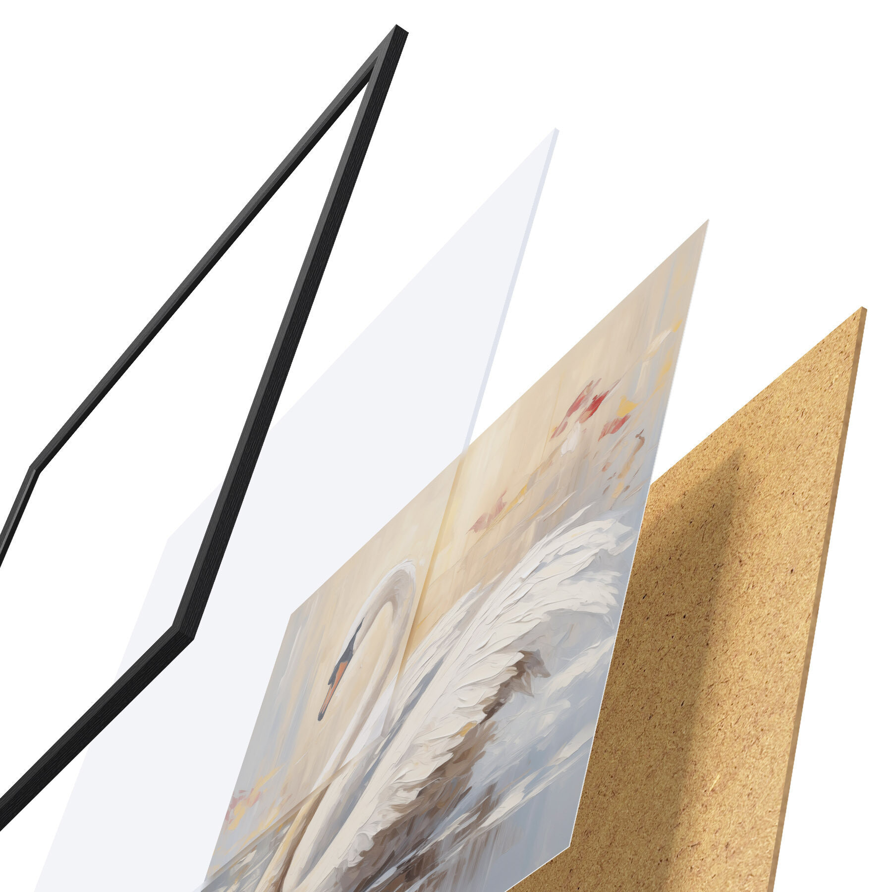 Plakát se skládá z rámu, plexiskla, tištěného obrazu a dřevotřískového podkladu. Díky úchytům na zadní straně lze plakát ihned zavěsit na zeď.