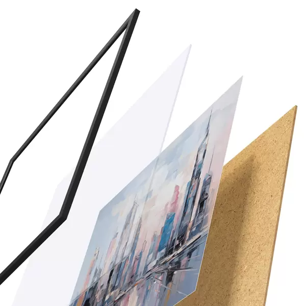 Plakát se skládá z rámu, plexiskla, tištěného obrazu a dřevotřískového podkladu. Díky úchytům na zadní straně lze plakát ihned zavěsit na zeď.