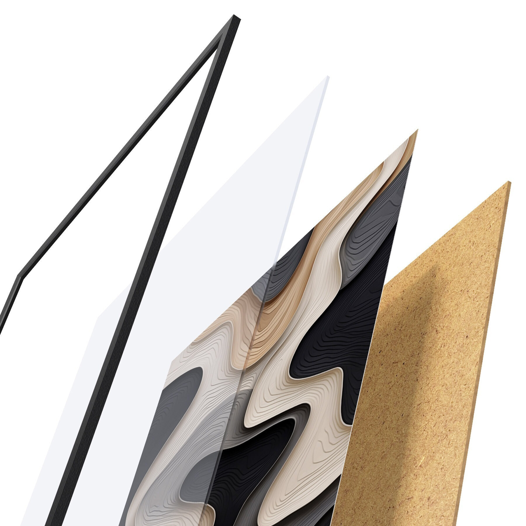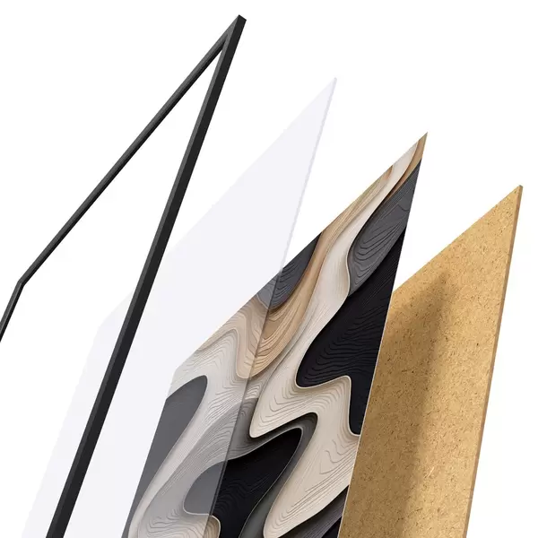 Plakát se skládá z rámu, plexiskla, tištěného obrazu a dřevotřískového podkladu. Díky úchytům na zadní straně lze plakát ihned zavěsit na zeď.