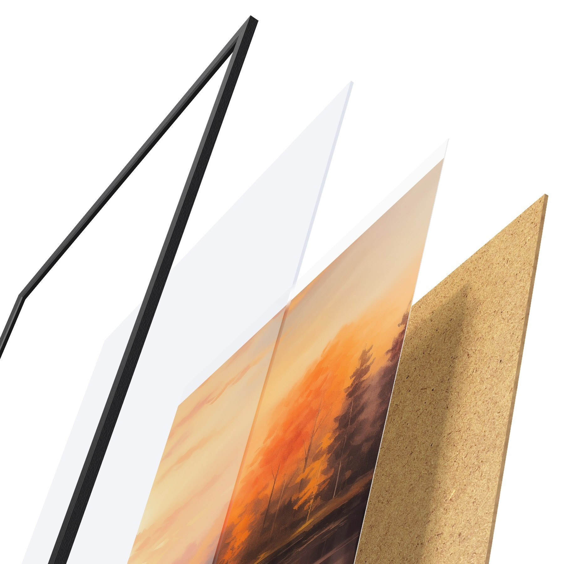 Plakát se skládá z rámu, plexiskla, tištěného obrazu a dřevotřískového podkladu. Díky úchytům na zadní straně lze plakát ihned zavěsit na zeď.