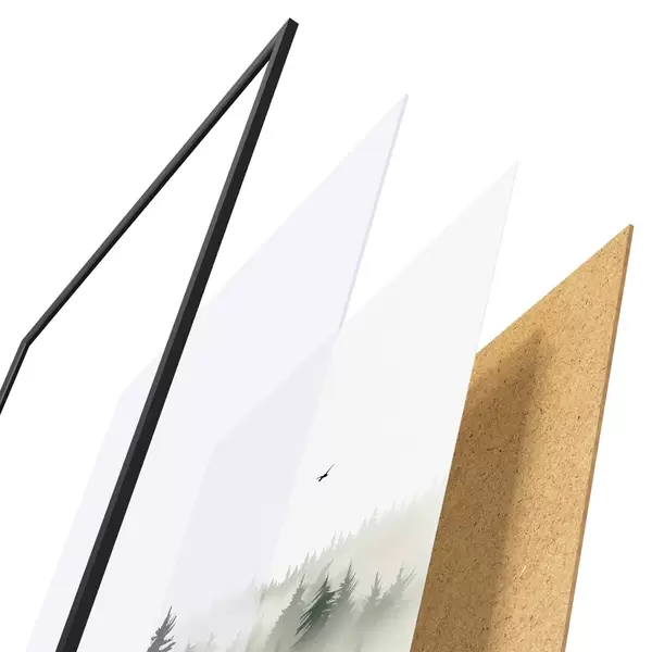 Plakát se skládá z rámu, plexiskla, tištěného obrazu a dřevotřískového podkladu. Díky úchytům na zadní straně lze plakát ihned zavěsit na zeď.