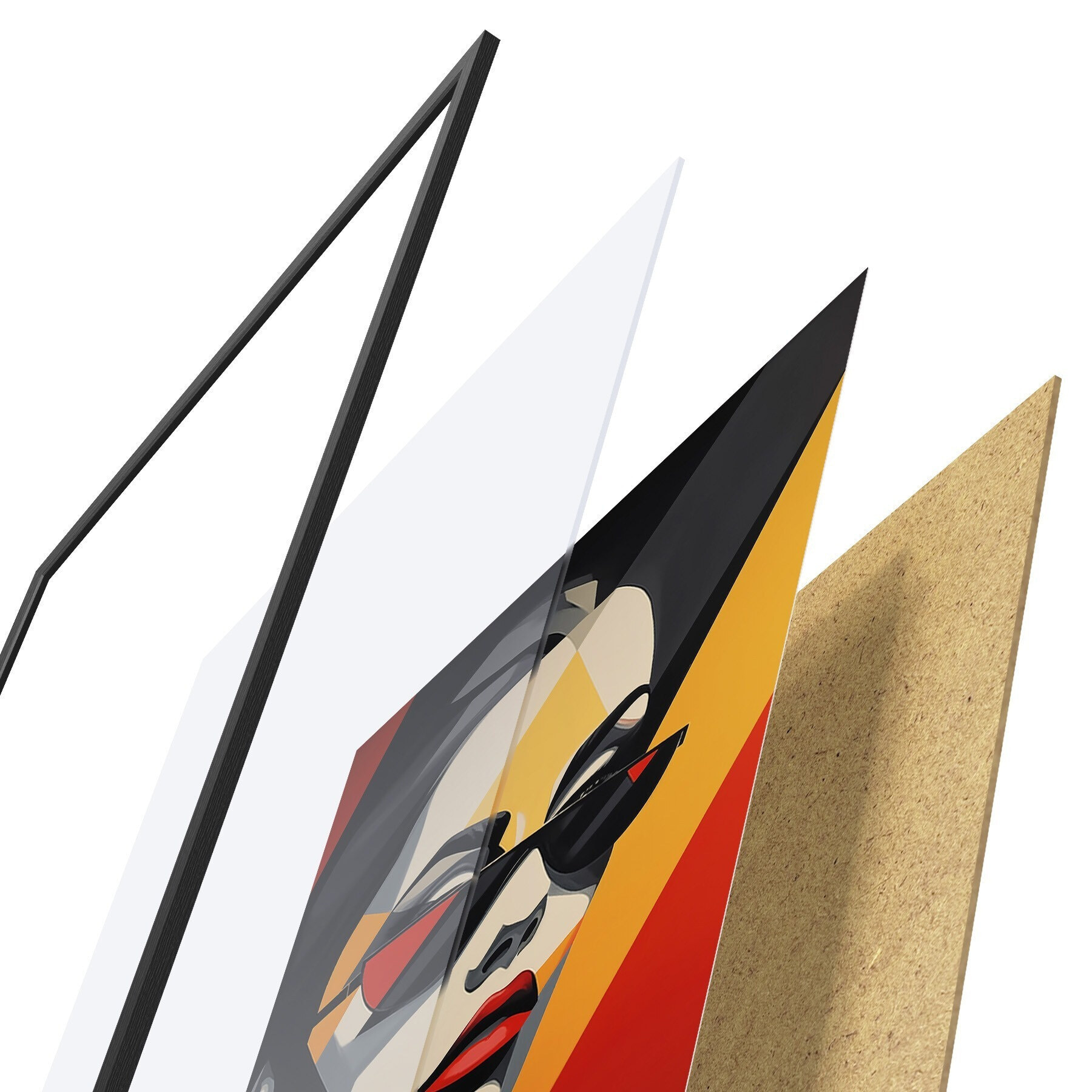 Plakát se skládá z rámu, plexiskla, tištěného obrazu a dřevotřískového podkladu. Díky úchytům na zadní straně lze plakát ihned zavěsit na zeď.