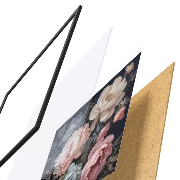 Plakát se skládá z rámu, plexiskla, tištěného obrazu a dřevotřískového podkladu. Díky úchytům na zadní straně lze plakát ihned zavěsit na zeď.
