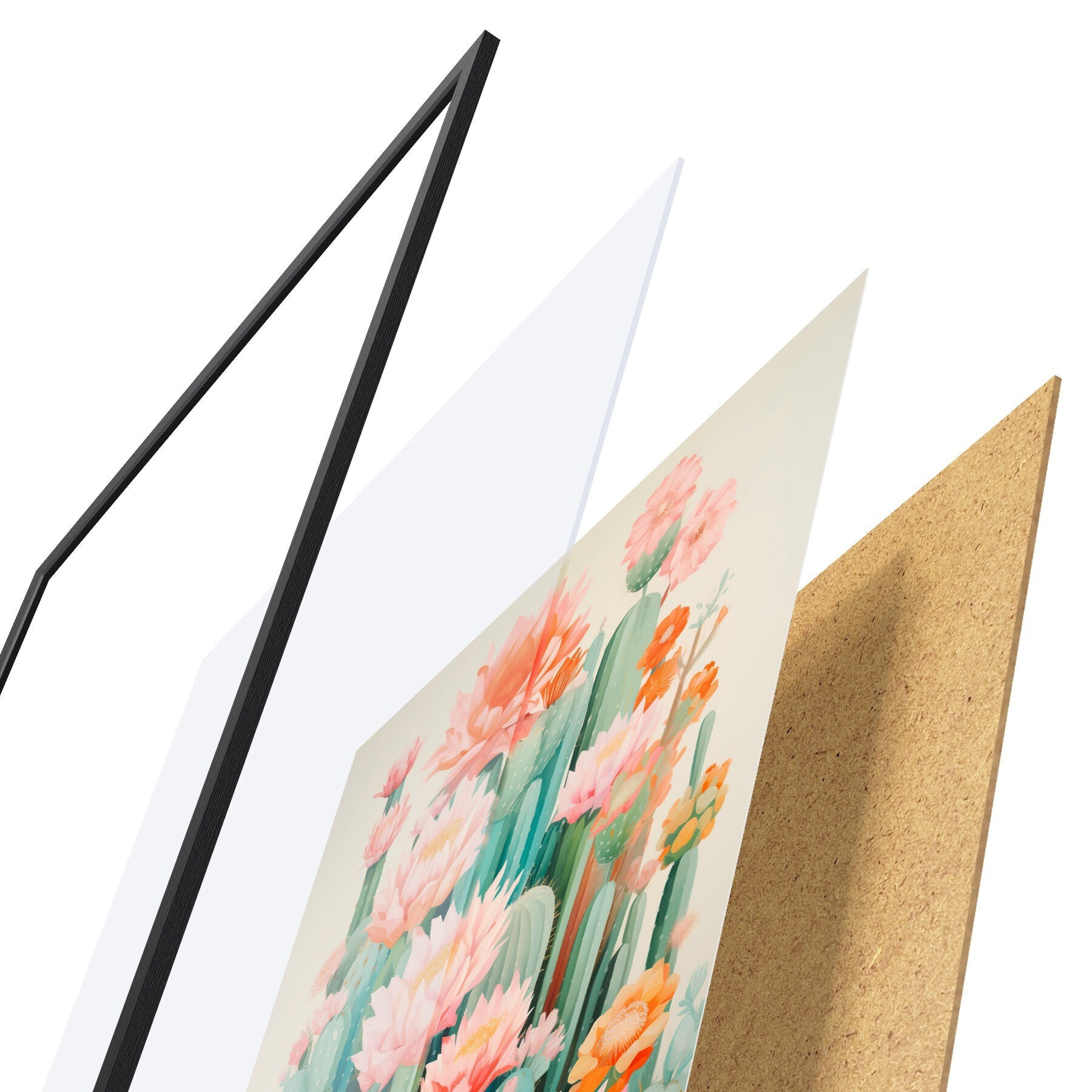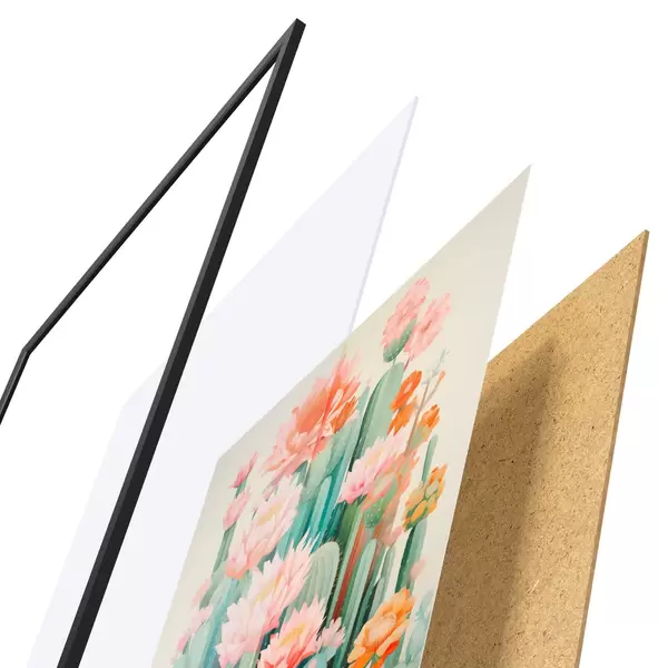 Plakát se skládá z rámu, plexiskla, tištěného obrazu a dřevotřískového podkladu. Díky úchytům na zadní straně lze plakát ihned zavěsit na zeď.