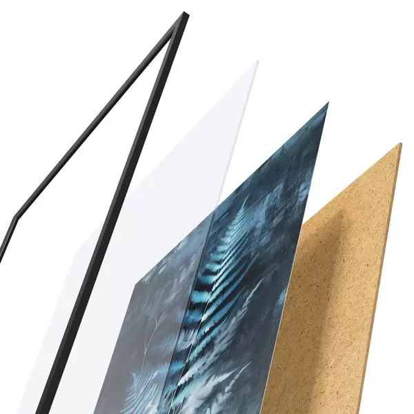 Plakát se skládá z rámu, plexiskla, tištěného obrazu a dřevotřískového podkladu. Díky úchytům na zadní straně lze plakát ihned zavěsit na zeď.