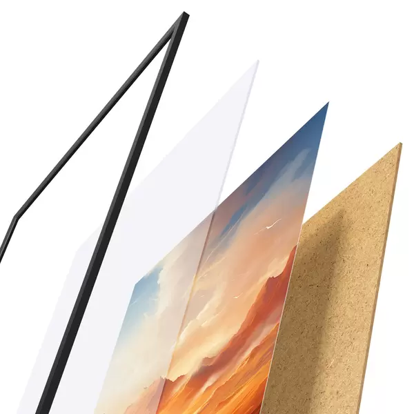 Plakát se skládá z rámu, plexiskla, tištěného obrazu a dřevotřískového podkladu. Díky úchytům na zadní straně lze plakát ihned zavěsit na zeď.