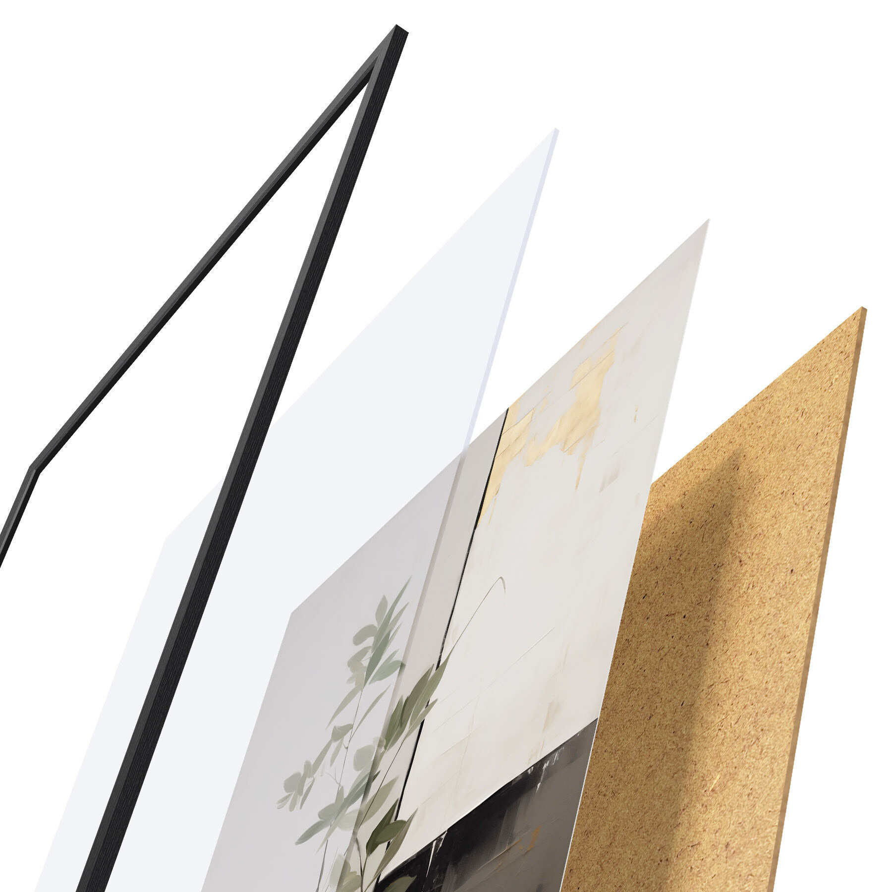 Plakát se skládá z rámu, plexiskla, tištěného obrazu a dřevotřískového podkladu. Díky úchytům na zadní straně lze plakát ihned zavěsit na zeď.