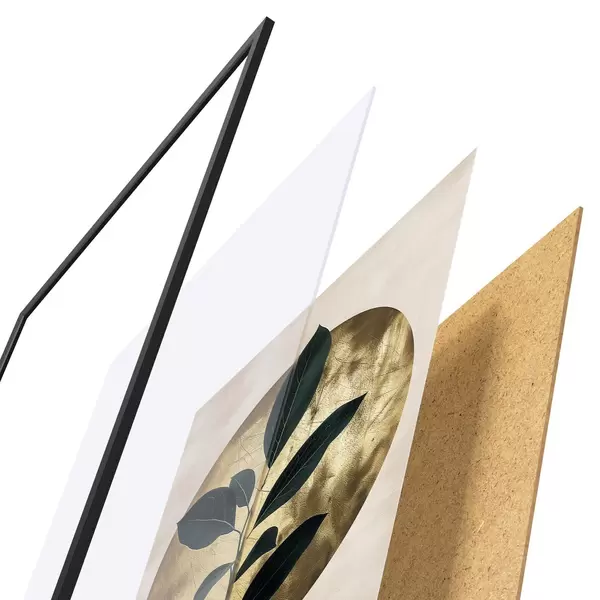 Plakát se skládá z rámu, plexiskla, tištěného obrazu a dřevotřískového podkladu. Díky úchytům na zadní straně lze plakát ihned zavěsit na zeď.