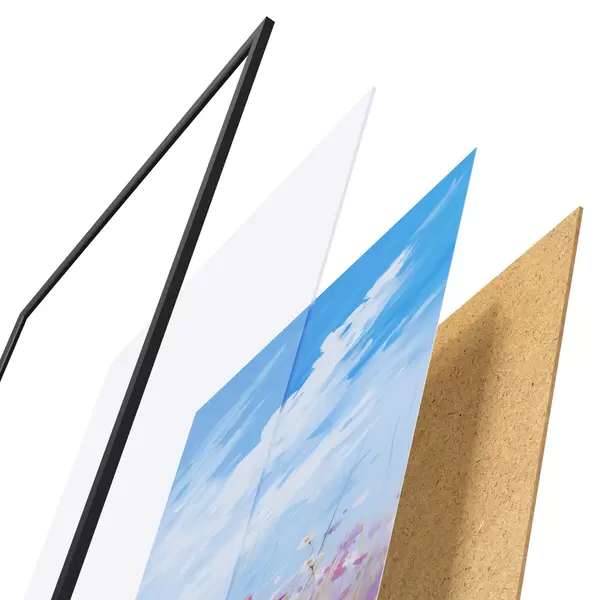 Plakát se skládá z rámu, plexiskla, tištěného obrazu a dřevotřískového podkladu. Díky úchytům na zadní straně lze plakát ihned zavěsit na zeď.