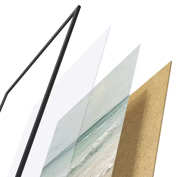 Plakát se skládá z rámu, plexiskla, tištěného obrazu a dřevotřískového podkladu. Díky úchytům na zadní straně lze plakát ihned zavěsit na zeď.