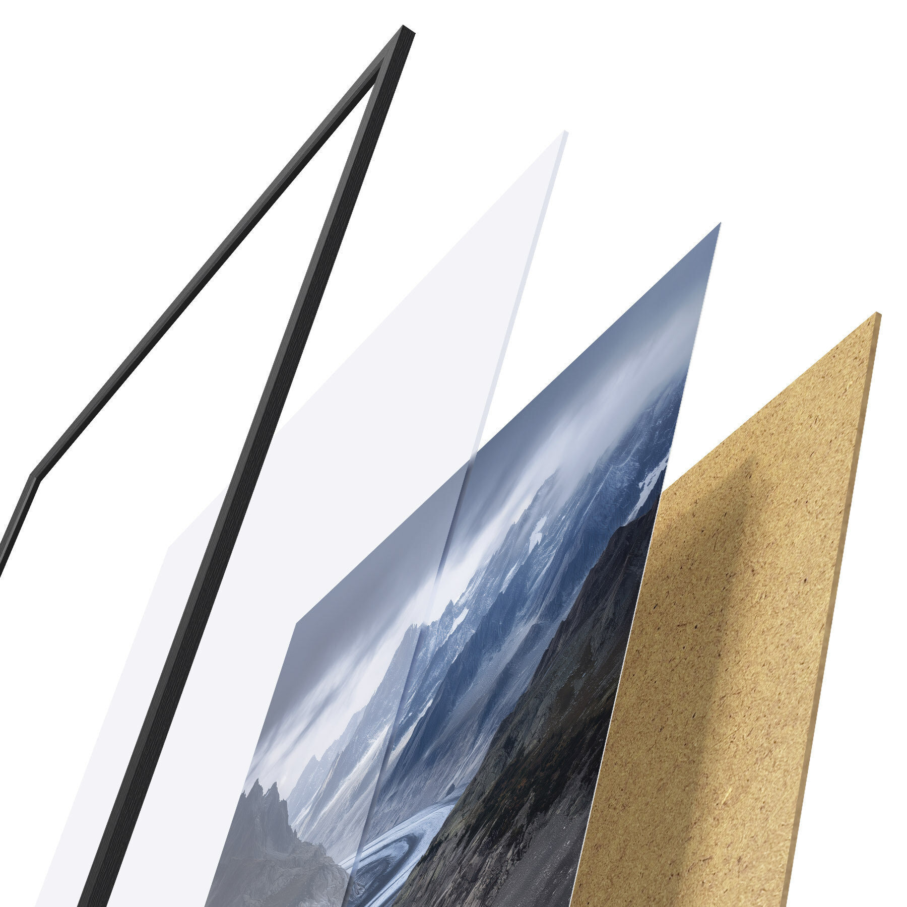 Plakát se skládá z rámu, plexiskla, tištěného obrazu a dřevotřískového podkladu. Díky úchytům na zadní straně lze plakát ihned zavěsit na zeď.