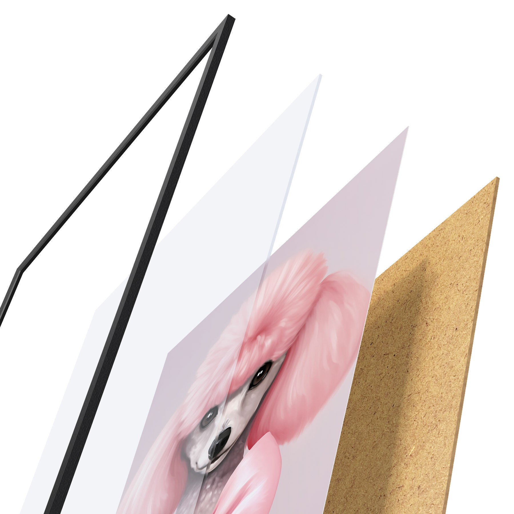 Plakát se skládá z rámu, plexiskla, tištěného obrazu a dřevotřískového podkladu. Díky úchytům na zadní straně lze plakát ihned zavěsit na zeď.