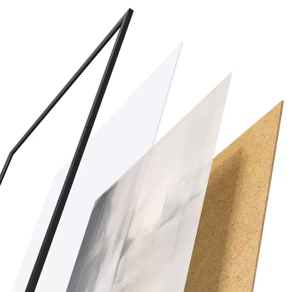 Plakát se skládá z rámu, plexiskla, tištěného obrazu a dřevotřískového podkladu. Díky úchytům na zadní straně lze plakát ihned zavěsit na zeď.