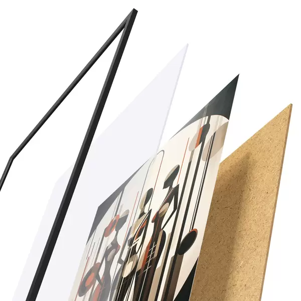 Plakát se skládá z rámu, plexiskla, tištěného obrazu a dřevotřískového podkladu. Díky úchytům na zadní straně lze plakát ihned zavěsit na zeď.