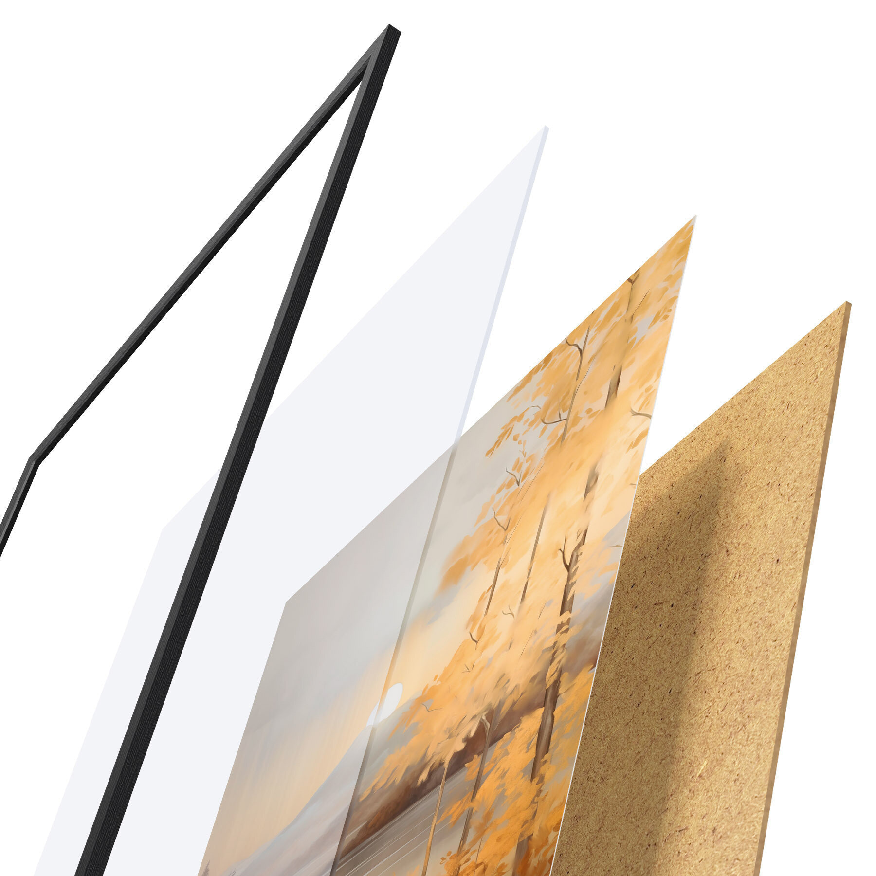 Plakát se skládá z rámu, plexiskla, tištěného obrazu a dřevotřískového podkladu. Díky úchytům na zadní straně lze plakát ihned zavěsit na zeď.