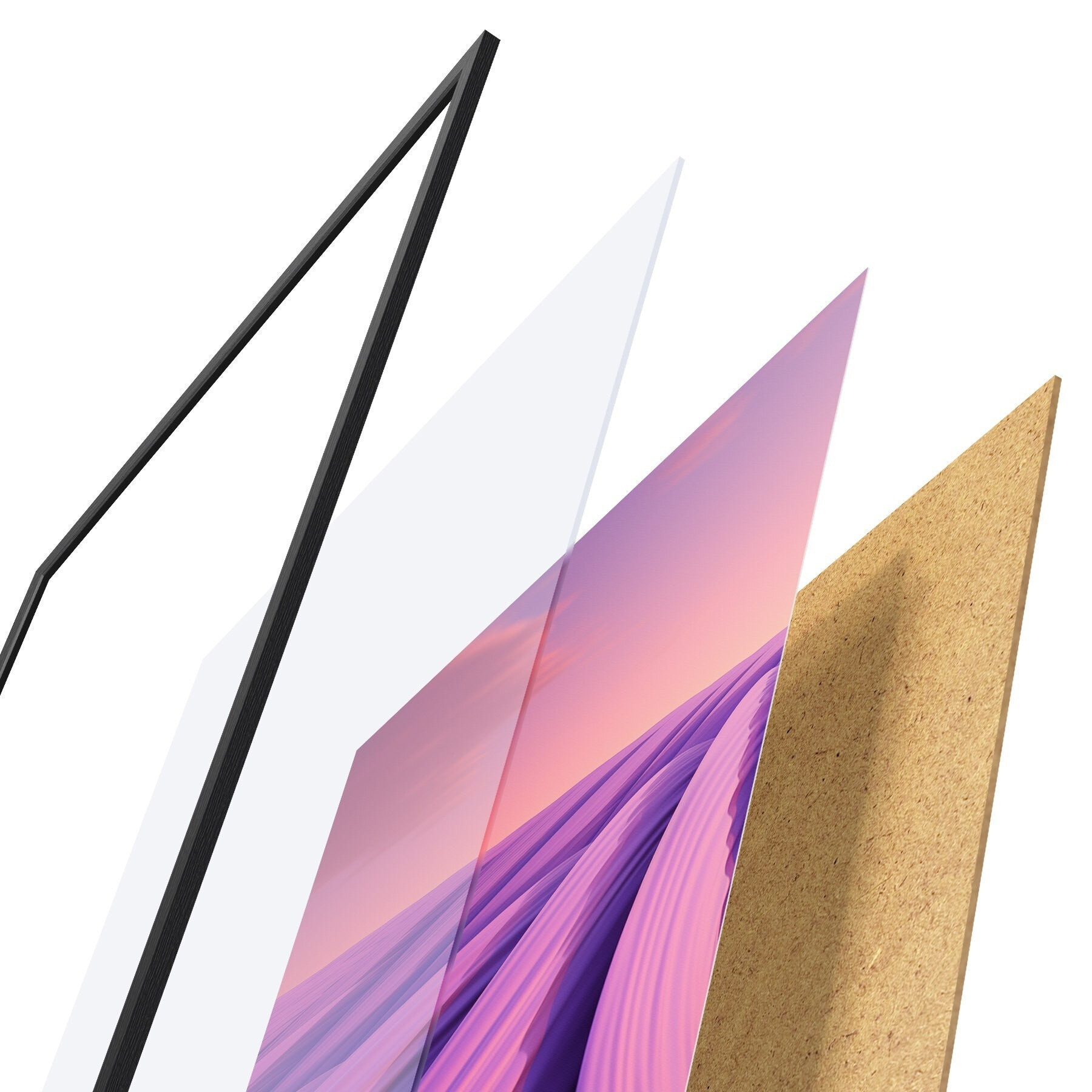 Plakát se skládá z rámu, plexiskla, tištěného obrazu a dřevotřískového podkladu. Díky úchytům na zadní straně lze plakát ihned zavěsit na zeď.