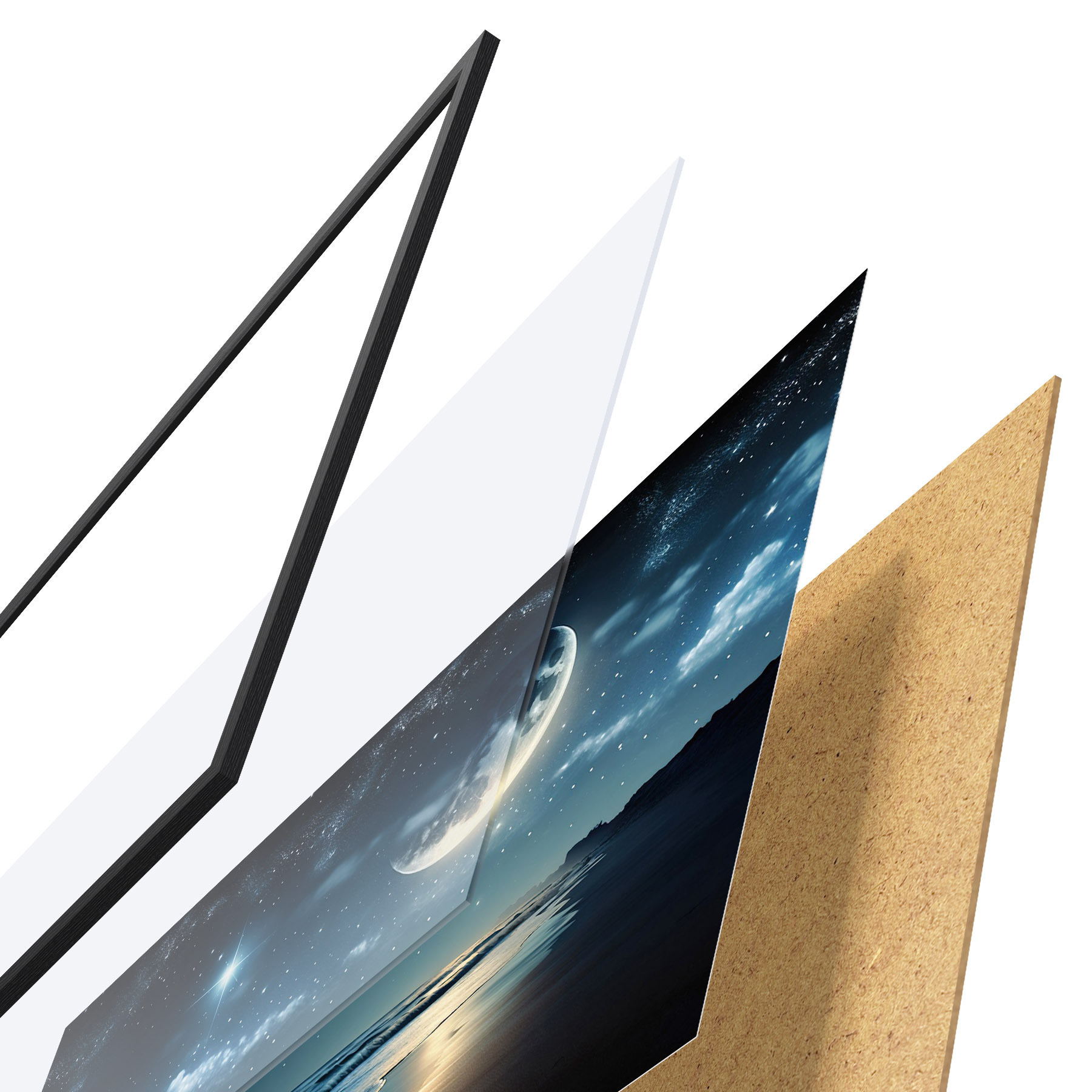 Plakát se skládá z rámu, plexiskla, tištěného obrazu a dřevotřískového podkladu. Díky úchytům na zadní straně lze plakát ihned zavěsit na zeď.