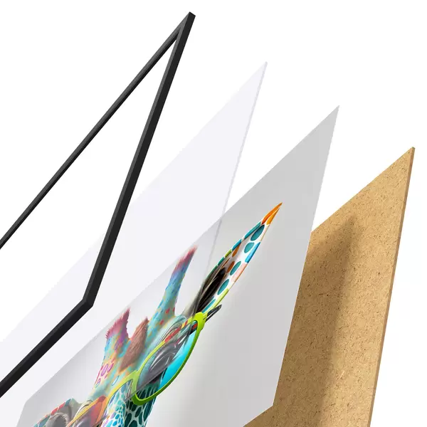 Plakát se skládá z rámu, plexiskla, tištěného obrazu a dřevotřískového podkladu. Díky úchytům na zadní straně lze plakát ihned zavěsit na zeď.