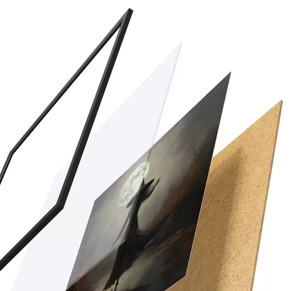 Plakát se skládá z rámu, plexiskla, tištěného obrazu a dřevotřískového podkladu. Díky úchytům na zadní straně lze plakát ihned zavěsit na zeď.