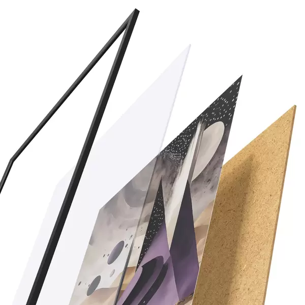 Plakát se skládá z rámu, plexiskla, tištěného obrazu a dřevotřískového podkladu. Díky úchytům na zadní straně lze plakát ihned zavěsit na zeď.