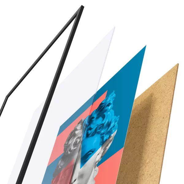 Plakát se skládá z rámu, plexiskla, tištěného obrazu a dřevotřískového podkladu. Díky úchytům na zadní straně lze plakát ihned zavěsit na zeď.