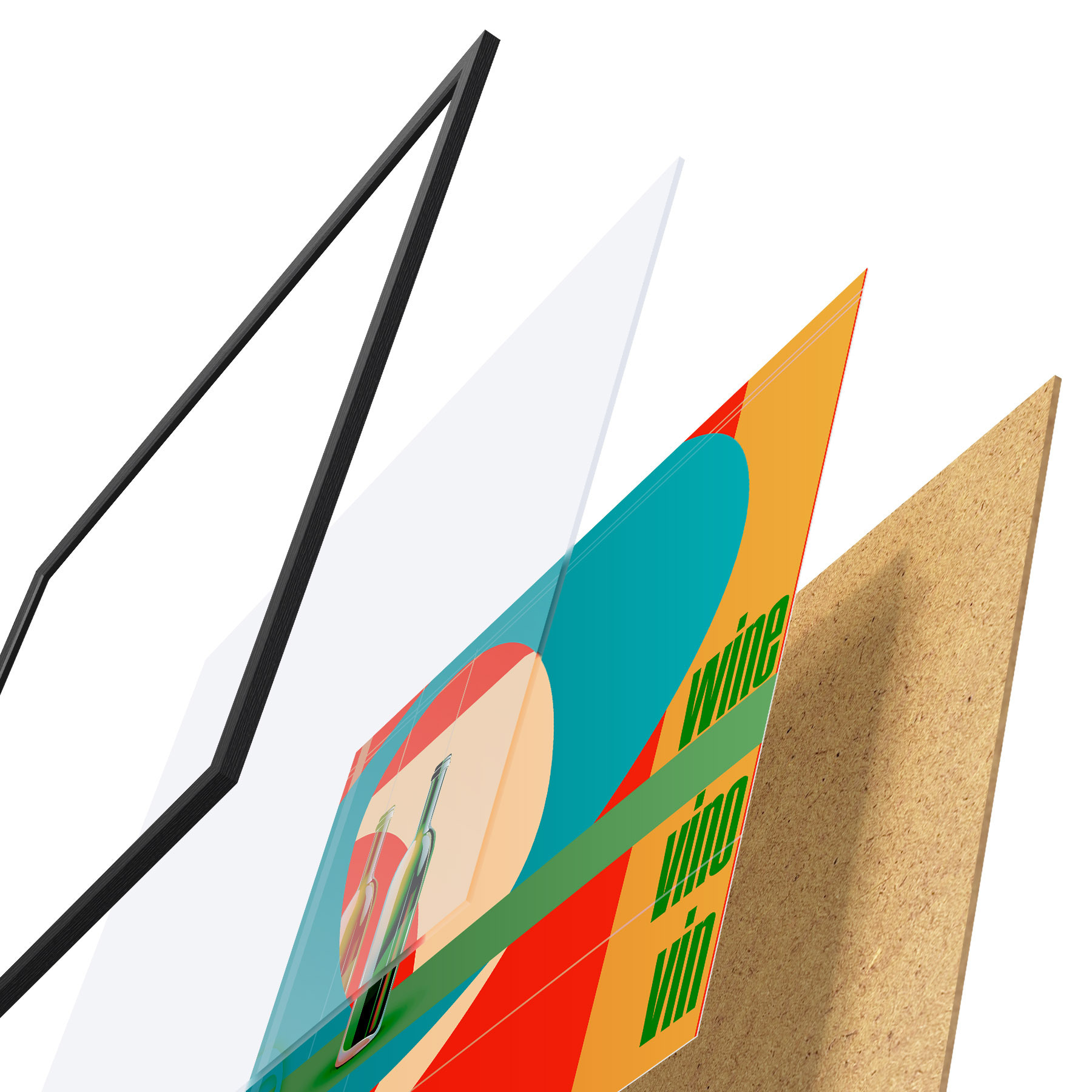 Plakát se skládá z rámu, plexiskla, tištěného obrazu a dřevotřískového podkladu. Díky úchytům na zadní straně lze plakát ihned zavěsit na zeď.