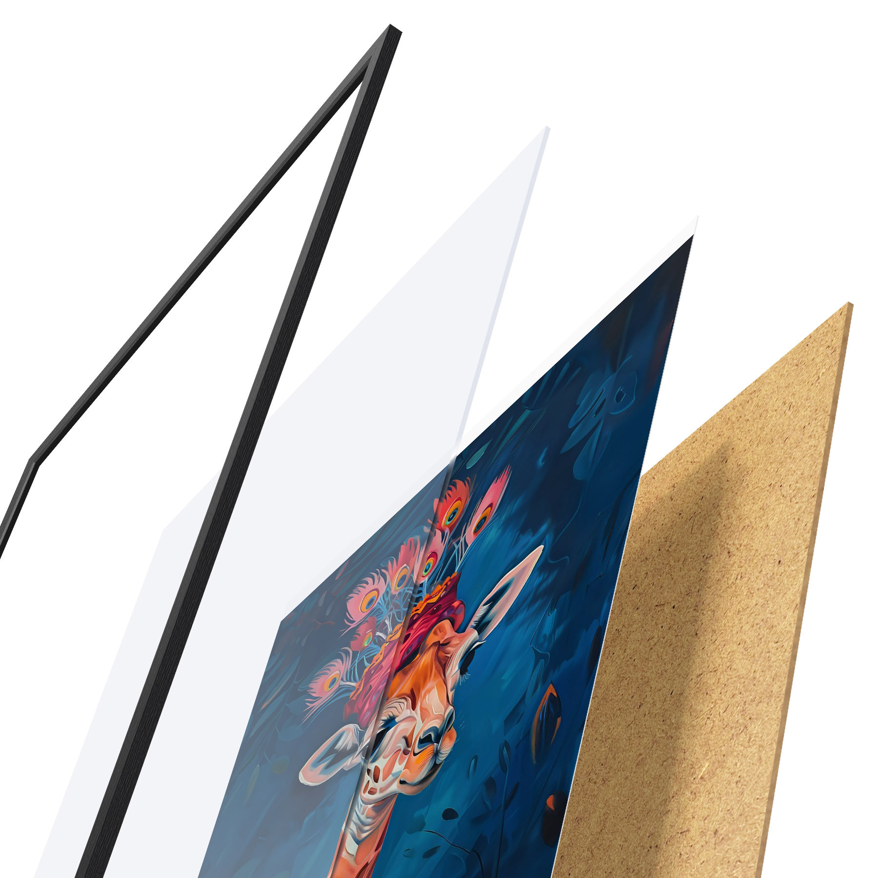 Plakát se skládá z rámu, plexiskla, tištěného obrazu a dřevotřískového podkladu. Díky úchytům na zadní straně lze plakát ihned zavěsit na zeď.