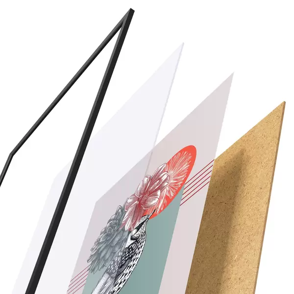 Plakát se skládá z rámu, plexiskla, tištěného obrazu a dřevotřískového podkladu. Díky úchytům na zadní straně lze plakát ihned zavěsit na zeď.
