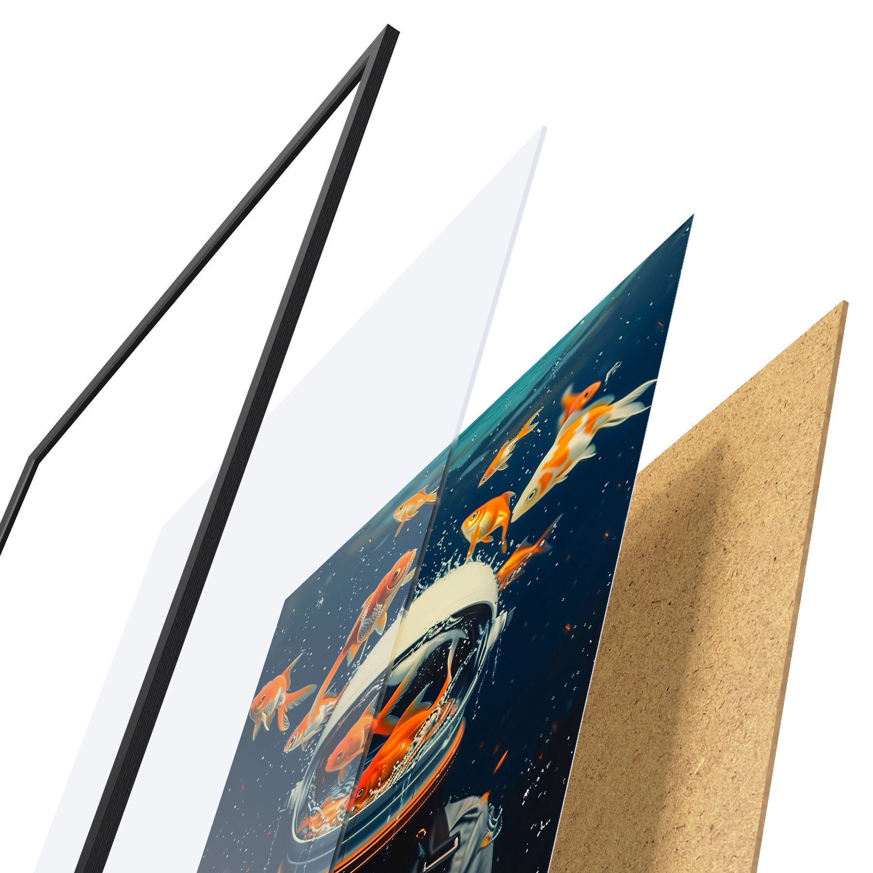 Plakát se skládá z rámu, plexiskla, tištěného obrazu a dřevotřískového podkladu. Díky úchytům na zadní straně lze plakát ihned zavěsit na zeď.