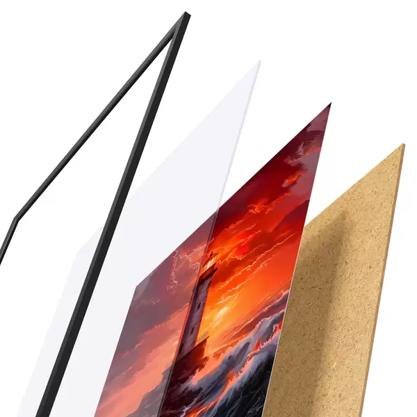 Plakát se skládá z rámu, plexiskla, tištěného obrazu a dřevotřískového podkladu. Díky úchytům na zadní straně lze plakát ihned zavěsit na zeď.