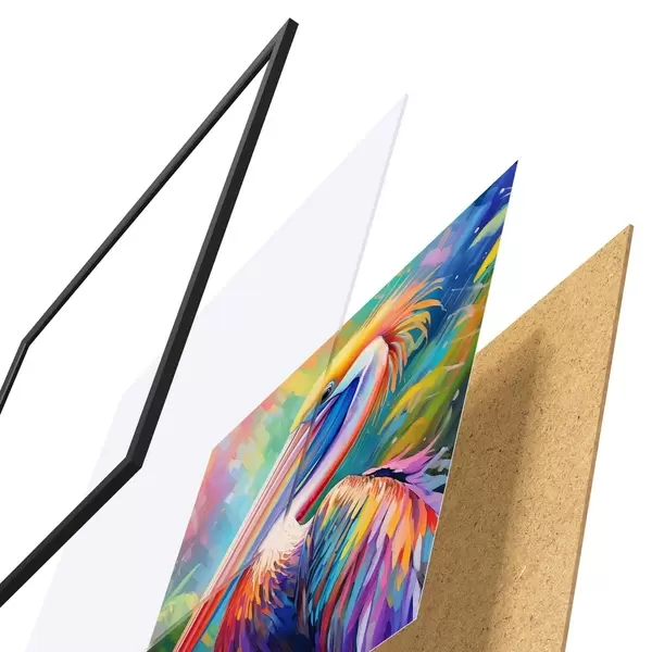 Plakát se skládá z rámu, plexiskla, tištěného obrazu a dřevotřískového podkladu. Díky úchytům na zadní straně lze plakát ihned zavěsit na zeď.
