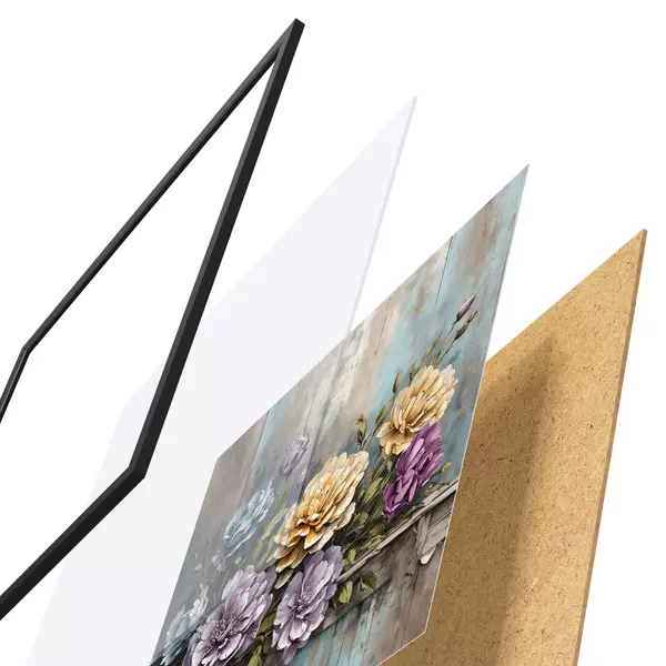 Plakát se skládá z rámu, plexiskla, tištěného obrazu a dřevotřískového podkladu. Díky úchytům na zadní straně lze plakát ihned zavěsit na zeď.