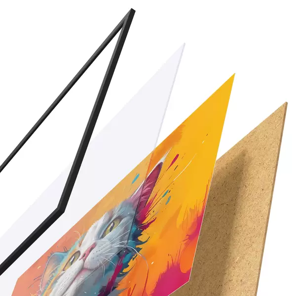 Plakát se skládá z rámu, plexiskla, tištěného obrazu a dřevotřískového podkladu. Díky úchytům na zadní straně lze plakát ihned zavěsit na zeď.