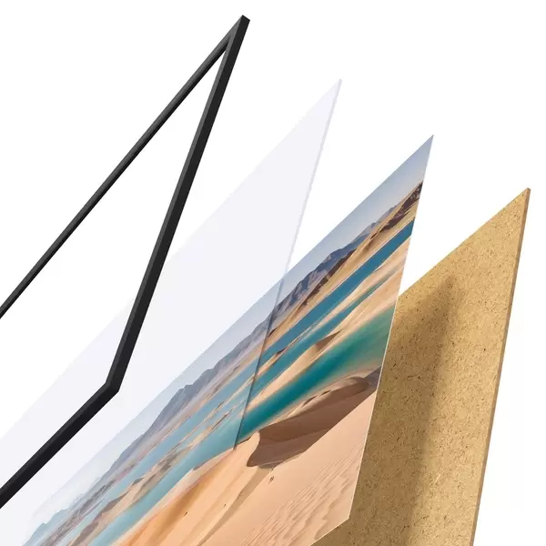 Plakát se skládá z rámu, plexiskla, tištěného obrazu a dřevotřískového podkladu. Díky úchytům na zadní straně lze plakát ihned zavěsit na zeď.