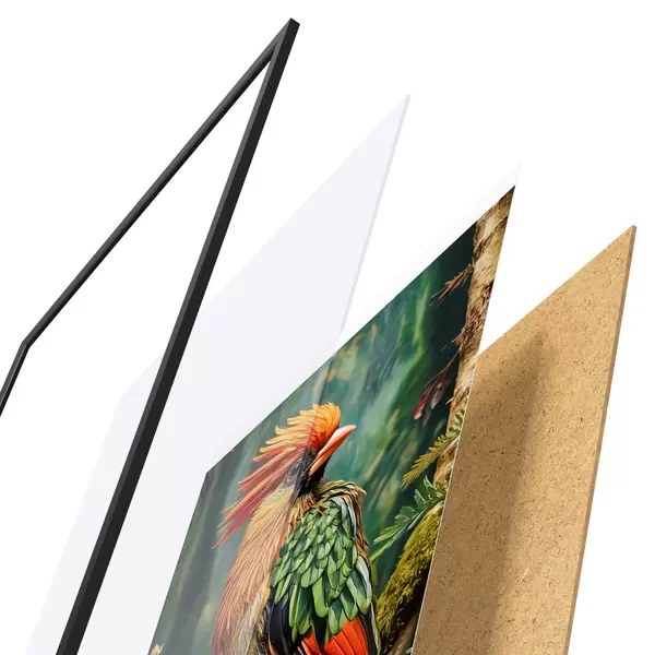 Plakát se skládá z rámu, plexiskla, tištěného obrazu a dřevotřískového podkladu. Díky úchytům na zadní straně lze plakát ihned zavěsit na zeď.