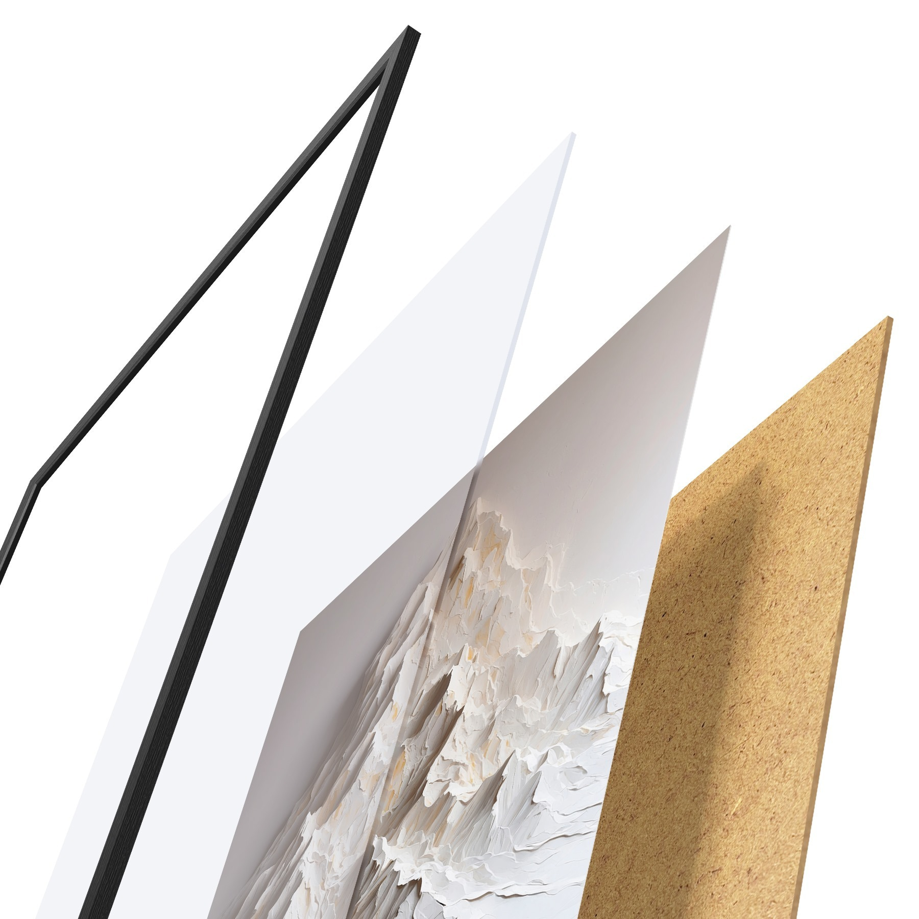 Plakát se skládá z rámu, plexiskla, tištěného obrazu a dřevotřískového podkladu. Díky úchytům na zadní straně lze plakát ihned zavěsit na zeď.