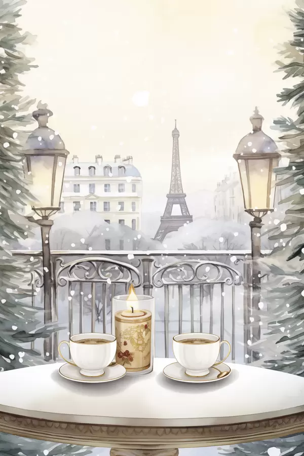 Poster Krásná kavárna v Paříži, čajové šálky, romantický výhled, zima, akvarel Č. f42799