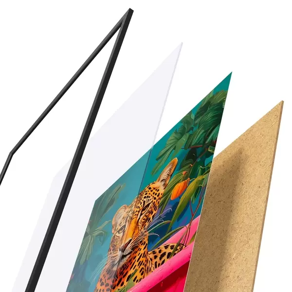 Plakát se skládá z rámu, plexiskla, tištěného obrazu a dřevotřískového podkladu. Díky úchytům na zadní straně lze plakát ihned zavěsit na zeď.