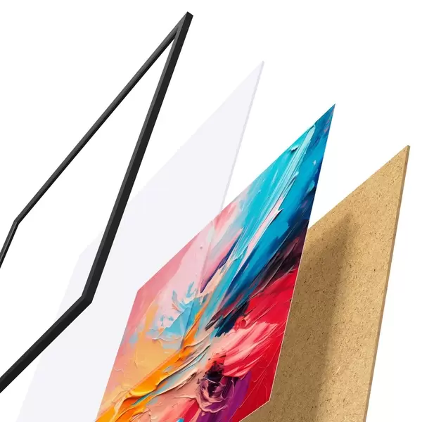 Plakát se skládá z rámu, plexiskla, tištěného obrazu a dřevotřískového podkladu. Díky úchytům na zadní straně lze plakát ihned zavěsit na zeď.