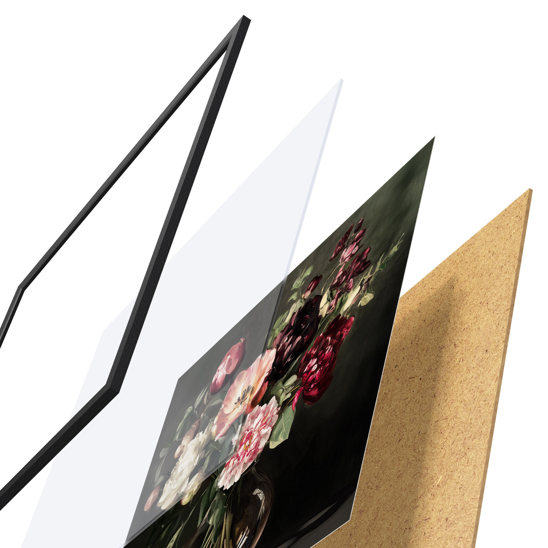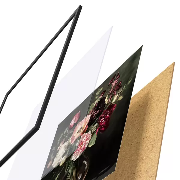 Plakát se skládá z rámu, plexiskla, tištěného obrazu a dřevotřískového podkladu. Díky úchytům na zadní straně lze plakát ihned zavěsit na zeď.