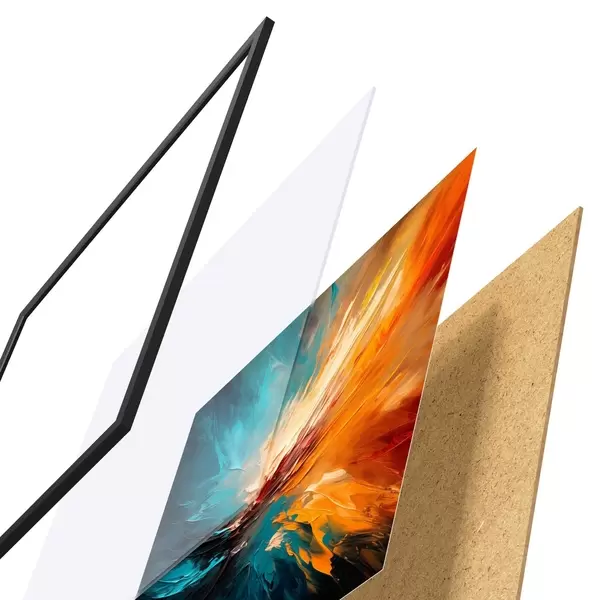 Plakát se skládá z rámu, plexiskla, tištěného obrazu a dřevotřískového podkladu. Díky úchytům na zadní straně lze plakát ihned zavěsit na zeď.