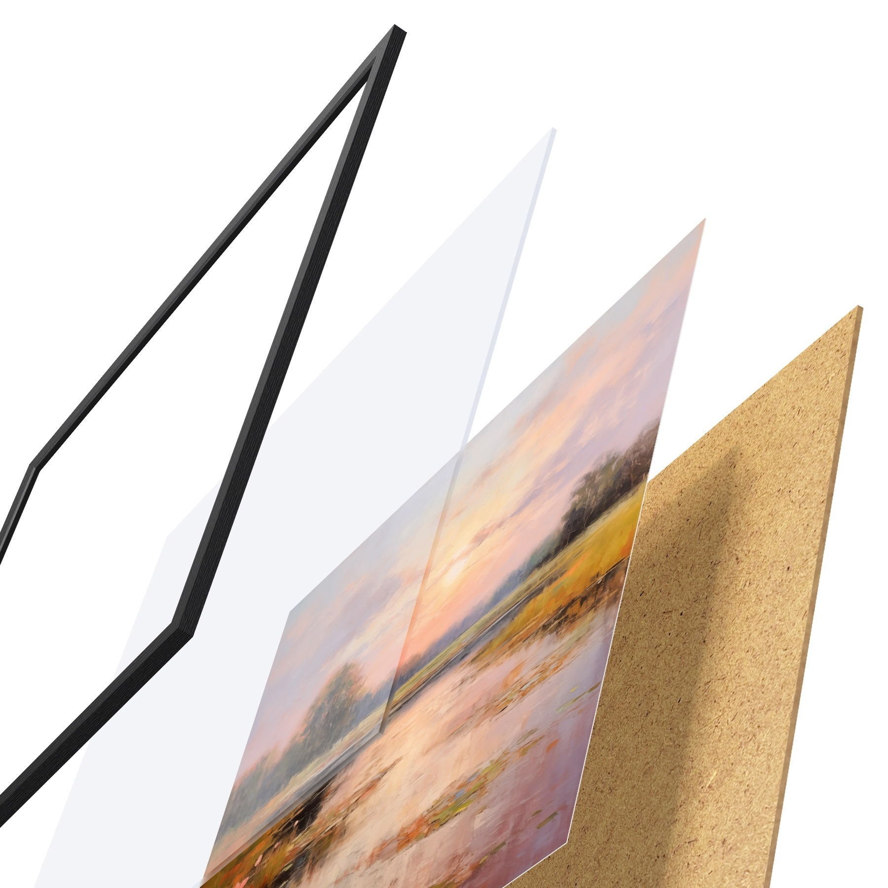 Plakát se skládá z rámu, plexiskla, tištěného obrazu a dřevotřískového podkladu. Díky úchytům na zadní straně lze plakát ihned zavěsit na zeď.