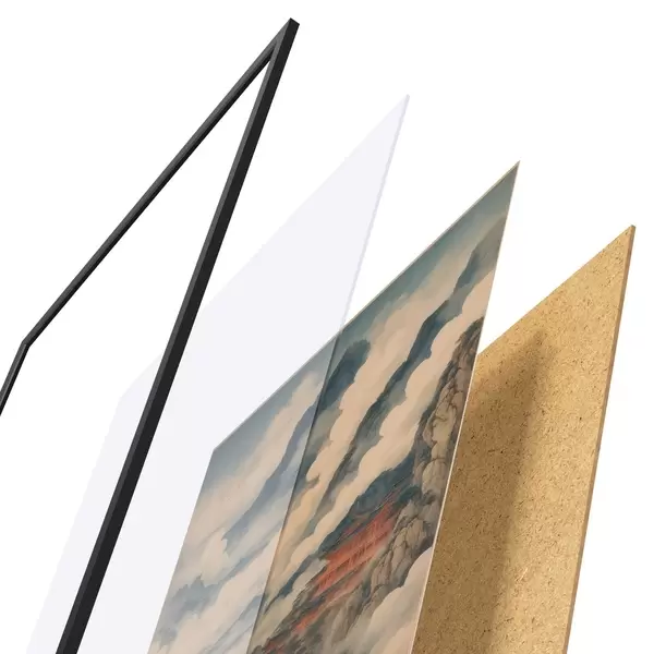 Plakát se skládá z rámu, plexiskla, tištěného obrazu a dřevotřískového podkladu. Díky úchytům na zadní straně lze plakát ihned zavěsit na zeď.