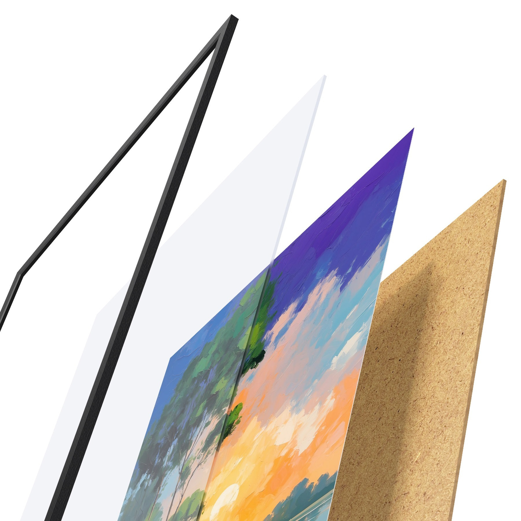 Plakát se skládá z rámu, plexiskla, tištěného obrazu a dřevotřískového podkladu. Díky úchytům na zadní straně lze plakát ihned zavěsit na zeď.