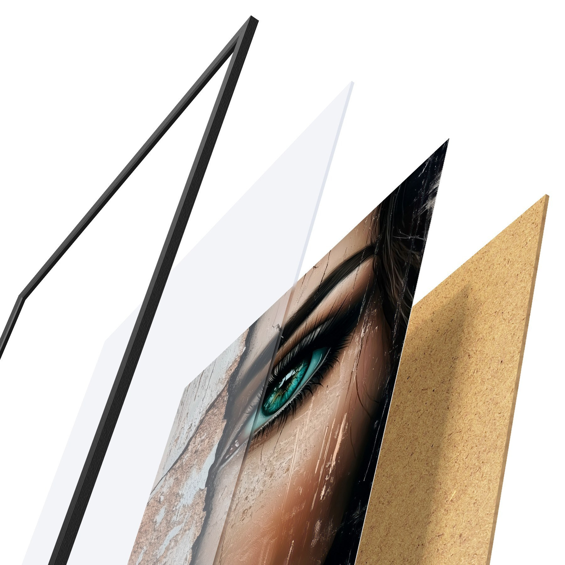 Plakát se skládá z rámu, plexiskla, tištěného obrazu a dřevotřískového podkladu. Díky úchytům na zadní straně lze plakát ihned zavěsit na zeď.